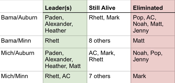 Heather, Jenny, Paden, Pop & Rhett tied with 9 wins and Alexander, Lance & Noah finished with 8 wins.