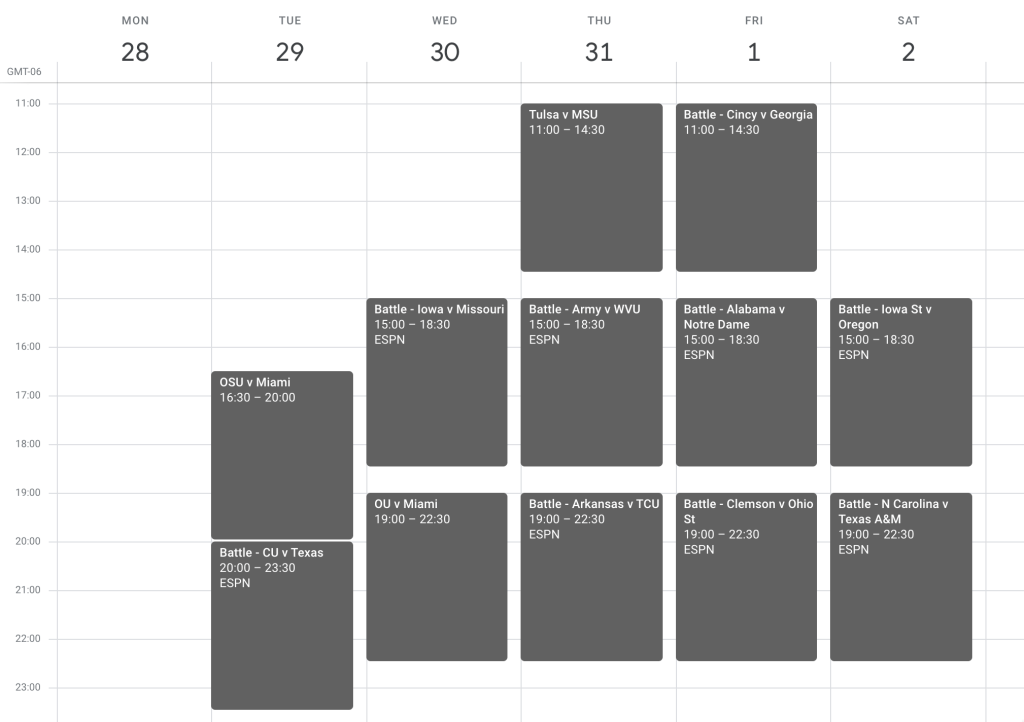 On the Standings (Family) page (link), you can now see the odds of each person winning ALL their remaining games per ESPN’s Football Power Index (see row 19 in the table). Here is the current snapshot with 8 games remaining.
