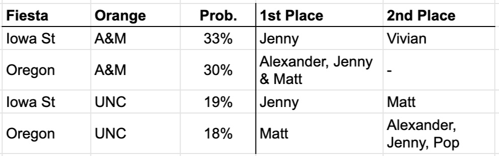 Assuming the Buckeyes hold serve for the win (96.9% probability), Paden is eliminated and we are down to 5 heading into tomorrow’s final games: Jenny, Matt, Vivian, Alexander & Pop.