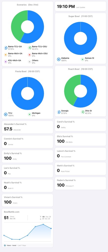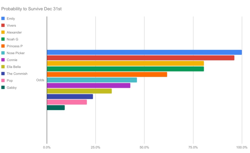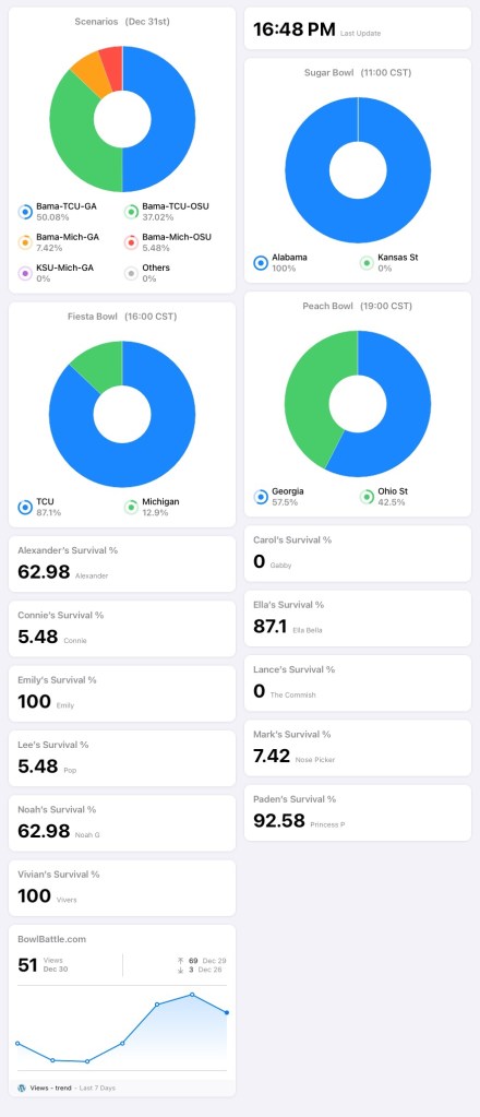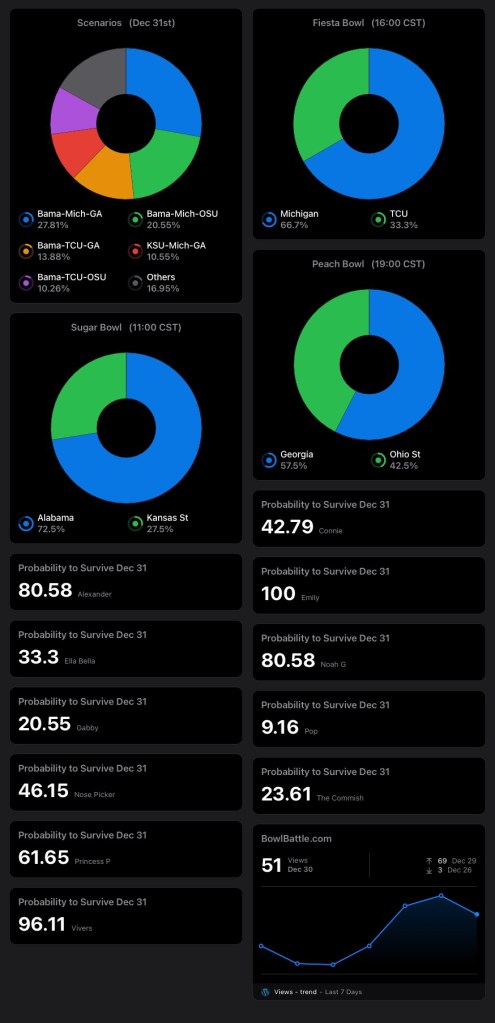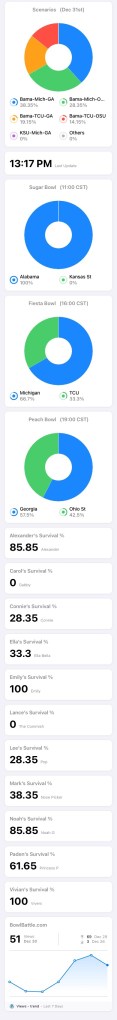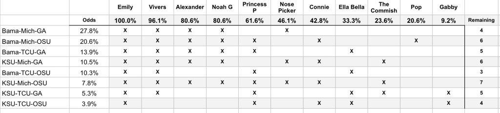 Four players will survive to Monday, regardless of the results of tonight’s Peach Bowl: Emily, Ella, Paden & Vivian.