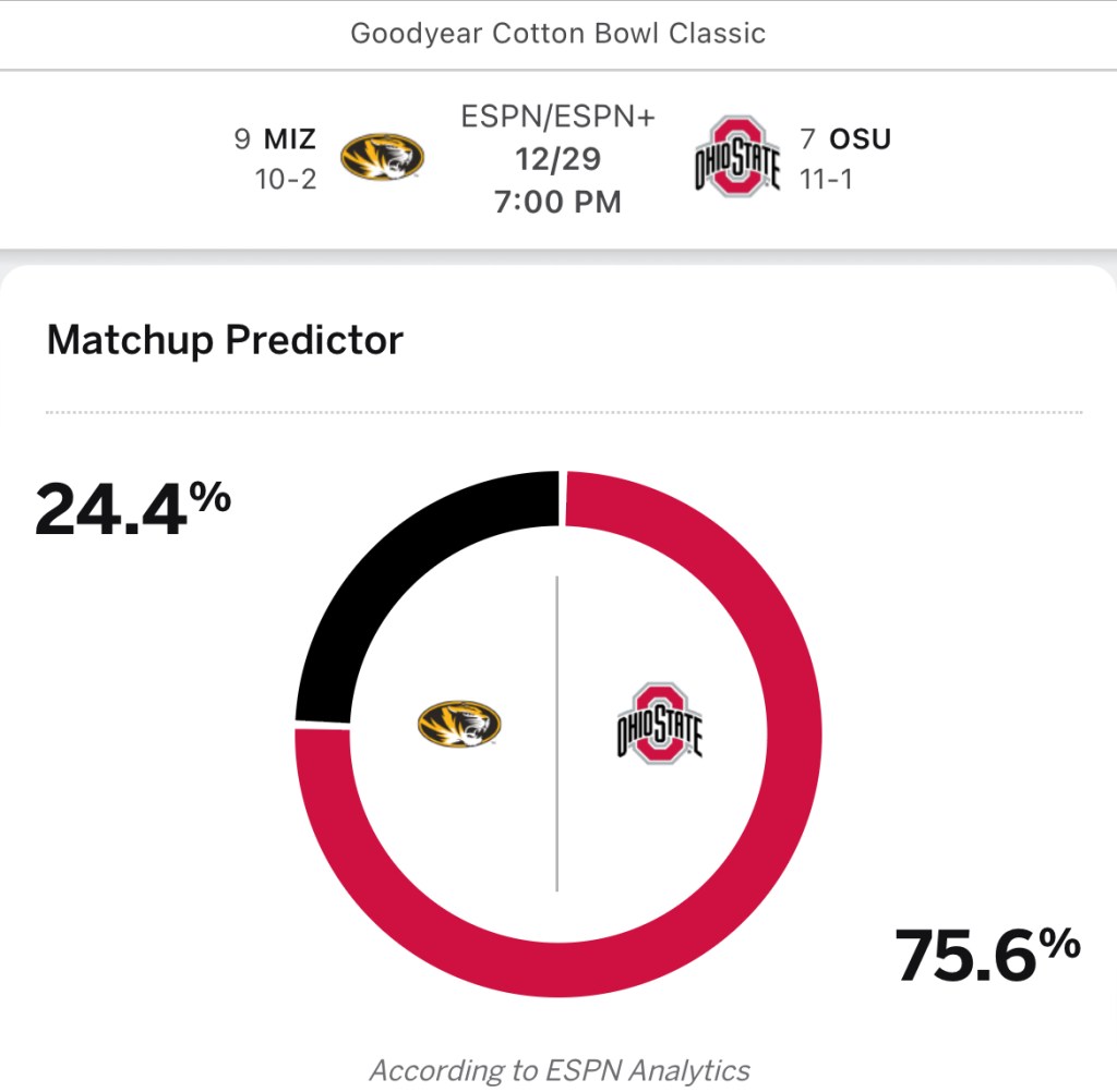 Friday gives us the Memphis Tigers versus Iowa State in the Liberty Bowl at 2:30. At 7:00, the Missouri Tigers take on Ohio State in the Cotton Bowl. Both games are on ESPN.