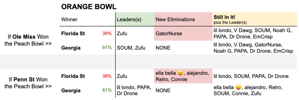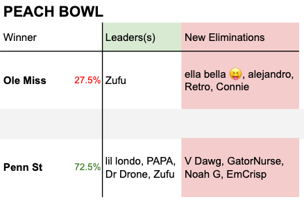 Part 1, Peach Bowl: The Peach Bowl will eliminate four players, regardless of who wins. A Penn State win will create a 4-way tie for first, including our youngest and oldest players!
