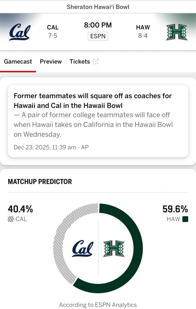 Viv, the lone undefeated team, and 18 of 25 players picked the underdog California Bears.